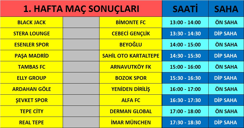 42. EBU MEDYA FUTBOL TURNUVASI 1.HAFTA MAÇ SAATLERİ VE LİG FİKSTÜRÜ YAYINDA. ![]() 42. EBU MEDYA FUTBOL TURNUVASI 1.HAFTA MAÇ SAATLERİ VE LİG FİKSTÜRÜ YAYINDA. Turnuvamızın 9. haftalık fikstürü yayınlandı ve ayrıca 1. hafta maç saatleri yayınlandı. Maç saatleri haftalık olarak sadece pazartesi günleri yayınlanmaktadır. İlk haftadan bazı maçların bizlerde heyecan yarattığını ve o maçları beklediğimizi şimdiden söyleyebiliriz. İŞTE 1. HAFTA MAÇ SAATLERİ YAYINDA.