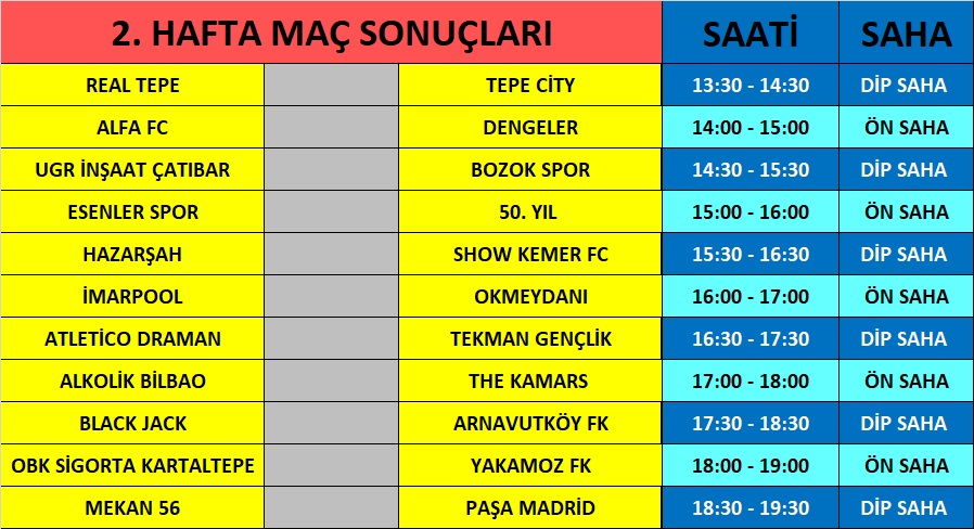 43. HASANOĞULLARI HAFRİYAT / EBU MEDYA FUTBOL TURNUVASI 2.HAFTA MAÇ SAATLERİ VE LİG FİKSTÜRÜ YAYINDA. ![]() 43. HASANOĞULLARI HAFRİYAT / EBU MEDYA FUTBOL TURNUVASI 2.HAFTA MAÇ SAATLERİ VE LİG FİKSTÜRÜ YAYINDA. Turnuvamızın ilk haftasında tam 3 maç berabere bitti ve 2 mac son 3 dakikada beraberlikten kurtuldu. İlk hafta maçları adeta nefes kesti. Tüm takımlara başarılar dileriz. İŞTE 2. HAFTA MAÇ SAATLERİ YAYINDA.