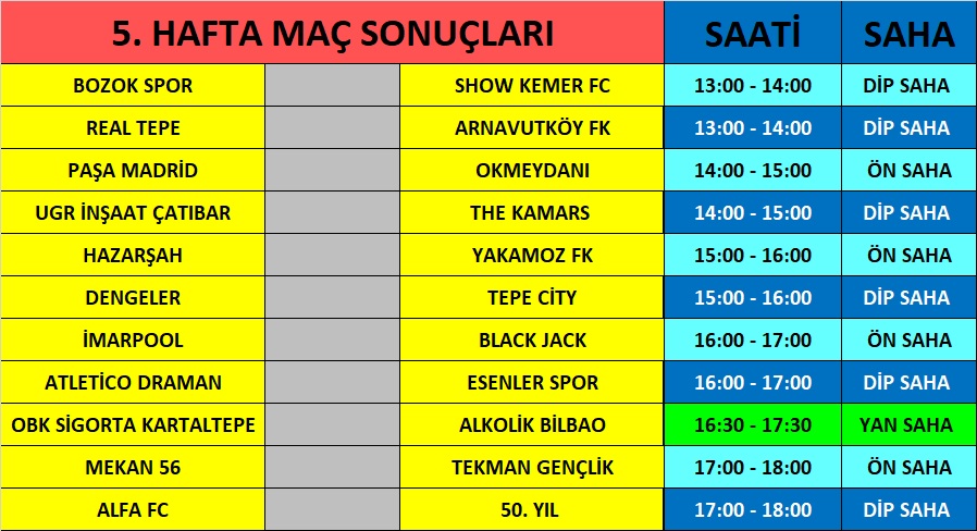 5. HAFTA MAÇ SAATLERİNE DERBİ AYARI... İŞTE MAÇ SAATLERİ YAYINDA.. ![]() HASANOĞULLARI HAFRİYAT / EBU MEDYA FUTBOL TURNUVASI 5. HAFTA MAÇ SAATLERİ YAYINDA.. BU HAFTA OYNANAN MAÇLAR ADETE DİKEN ÜSTÜYDÜ. Hedef maçlar kendini hissettirdi. Tüm bu maçların yorumu salı günü 18:00 da EBU MEDYA you tube kanalında sizlerle.. Tüm takımlara basarılar dılerız. İŞTE MAÇ SAATLERİ..
