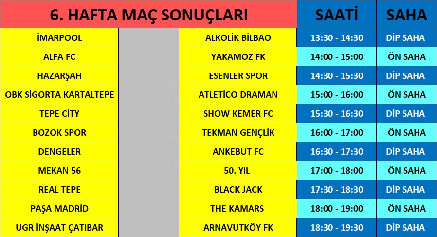 HASANOĞULLARI HAFRİYAT / EBU MEDYA FUTBOL TURNUVASI 6. HAFTA MAÇ SAATLERİ YAYINDA.. ![]() HASANOĞULLARI HAFRİYAT / EBU MEDYA FUTBOL TURNUVASI 6. HAFTA MAÇ SAATLERİ YAYINDA.. Bu hafta oynanan maçların yorumları salı günü 18:30 da EBU MEDYA you tube kanalında sizlerle.. Tüm takımlara basarılar dılerız. İŞTE MAÇ SAATLERİ..